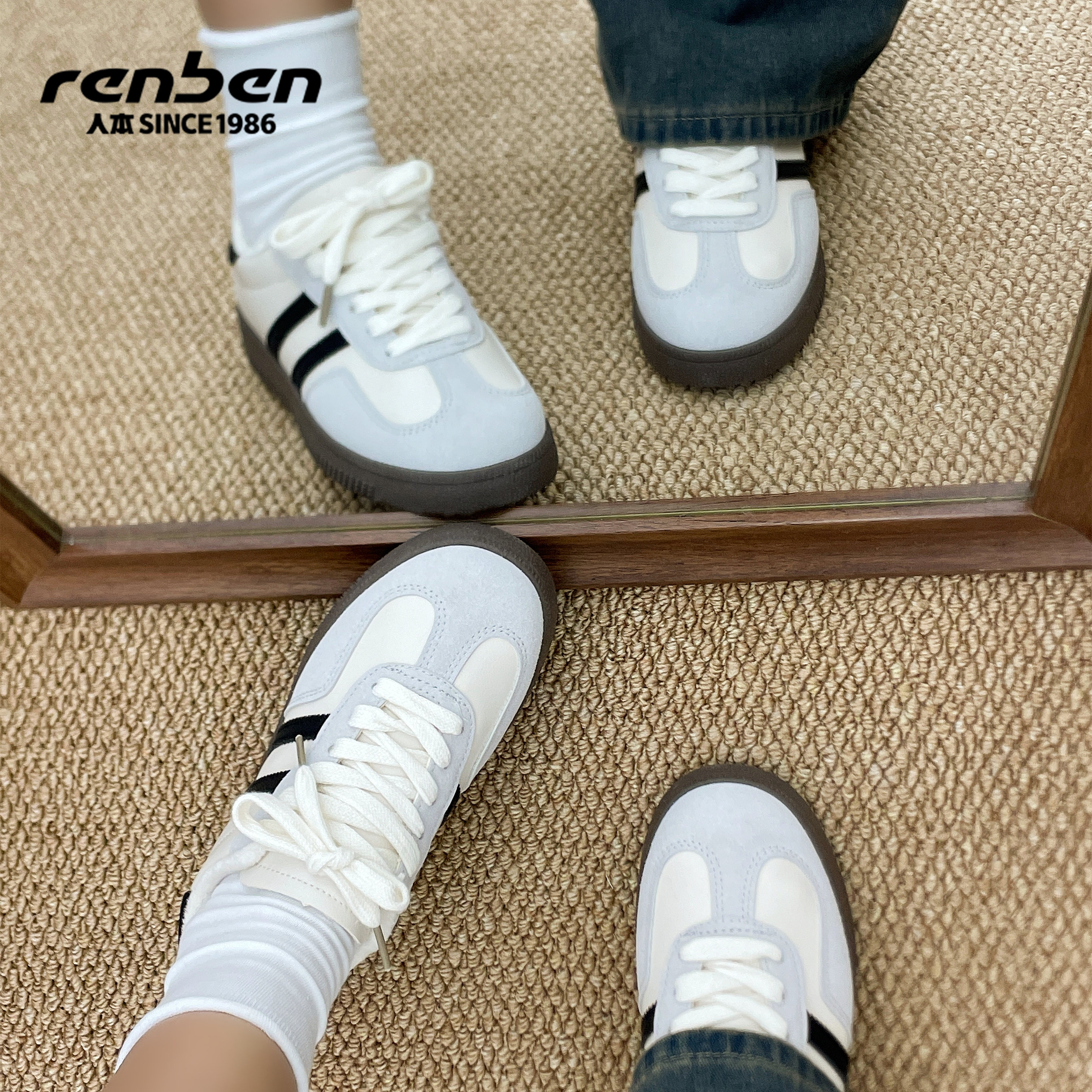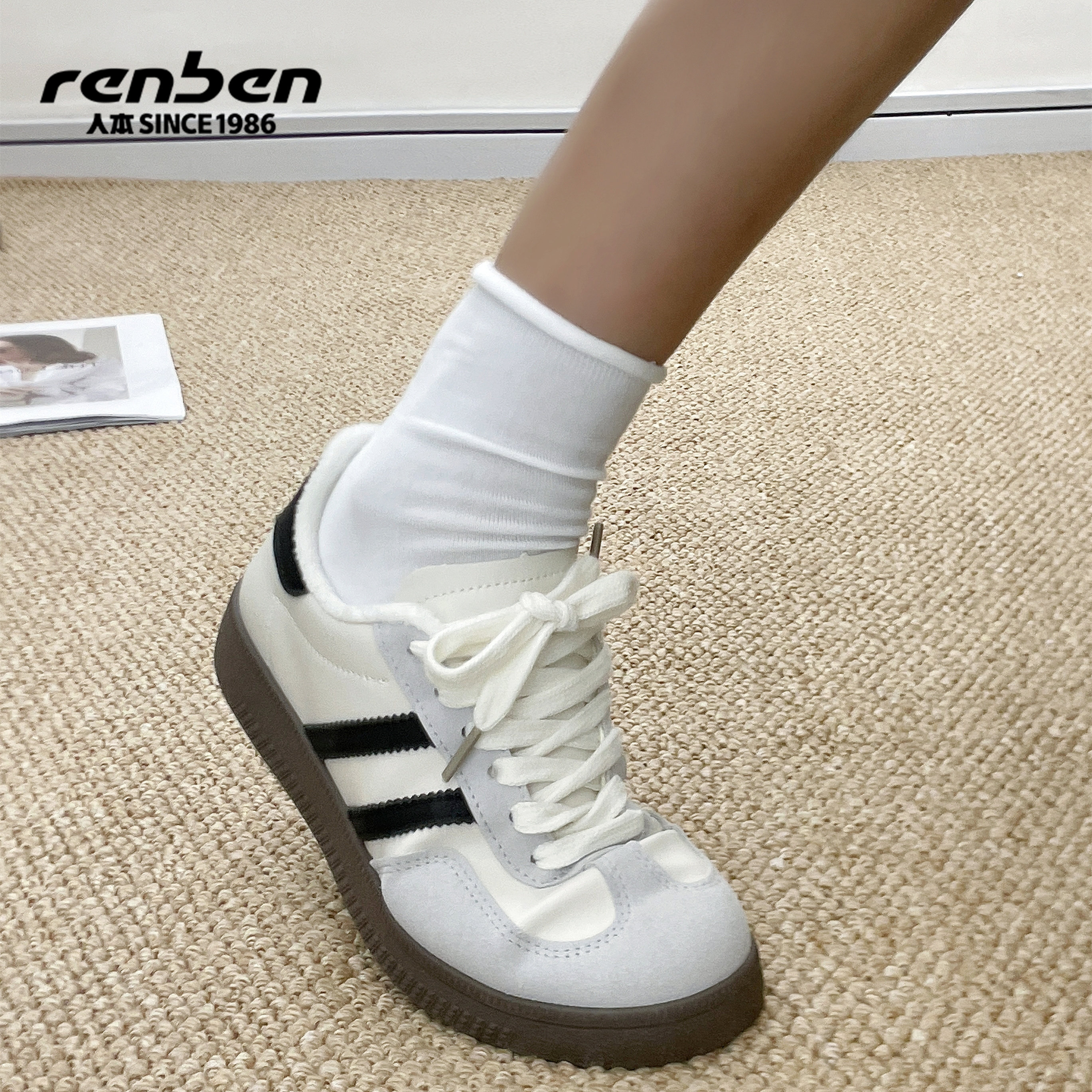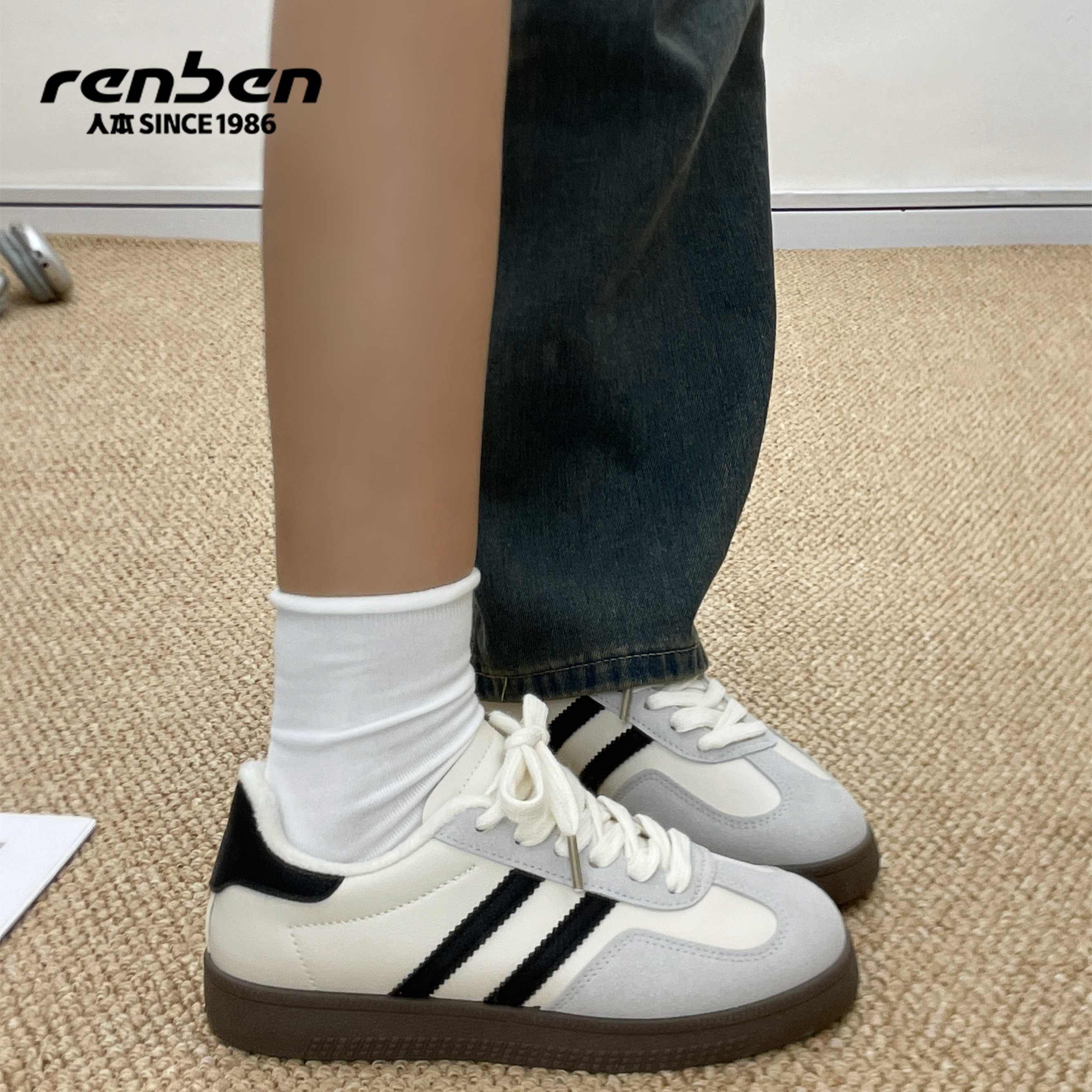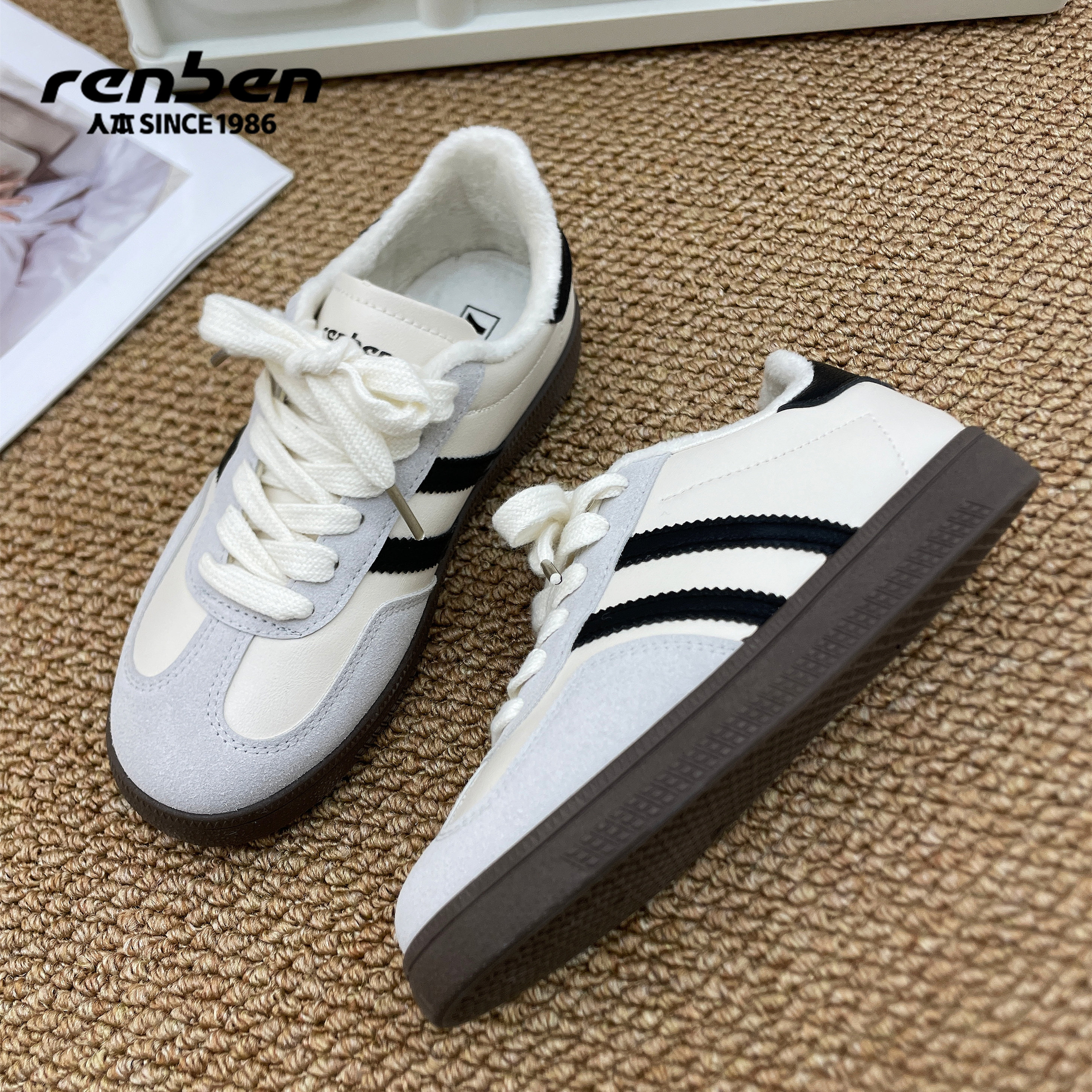 人本加绒小白鞋女2025新款春季保暖复古德训鞋学生百搭平底板鞋子