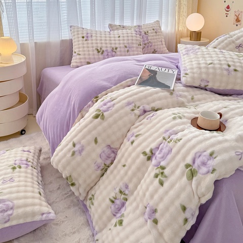 A【良品本色】高奢皮草绒印花四件套兔兔绒牛奶床品大泡泡四件套