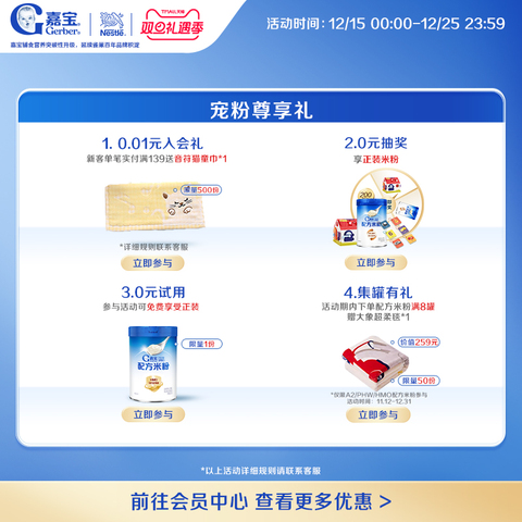 【券后834元,折139/罐;新客单笔实付满139元送印花童巾(限量500份),单笔买1组赠云朵被(限量100份),满8罐送大象超柔毯(限量200份)】嘉宝辅食营养突破性升级,延续雀巢百年品牌积淀!首·个配方米粉系列,肚肚舒适双子星,营养亲和好吸收!