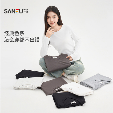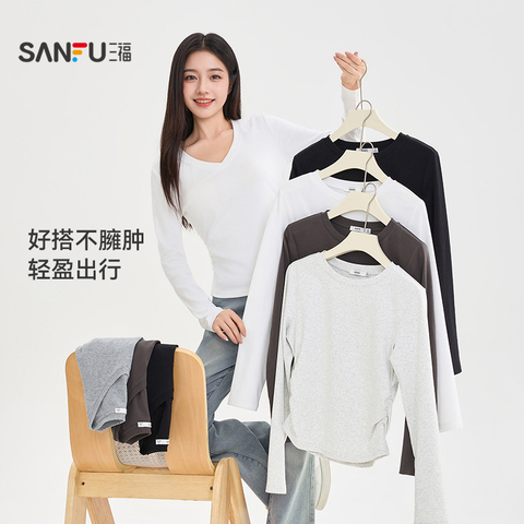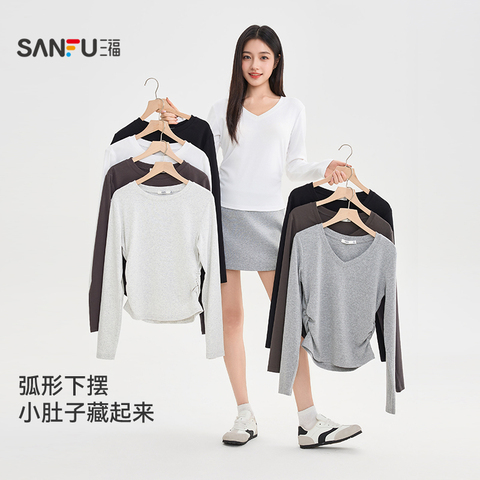 三福打底衫女2025新款秋季简约纯色收腰V领修身休闲长袖上衣女装