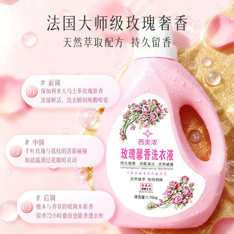 西美浓香氛洗衣液,玫瑰花香持久留香,长续航除臭体验更出众,健康不添加,洗衣更安心,自然纯净配方,顽固污渍不留痕,一洗而净!