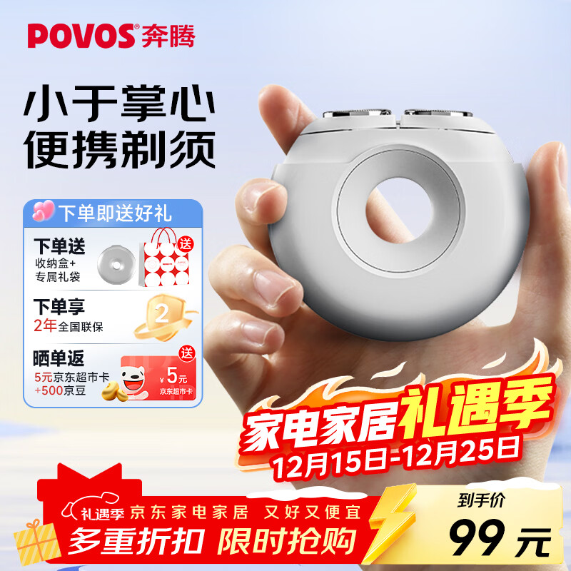 奔腾(POVOS)剃须刀甜甜圈2.0电动迷你便携T003月光白刮胡刀智能剃胡刀 新年送男友老公父亲生日圣诞实用礼物