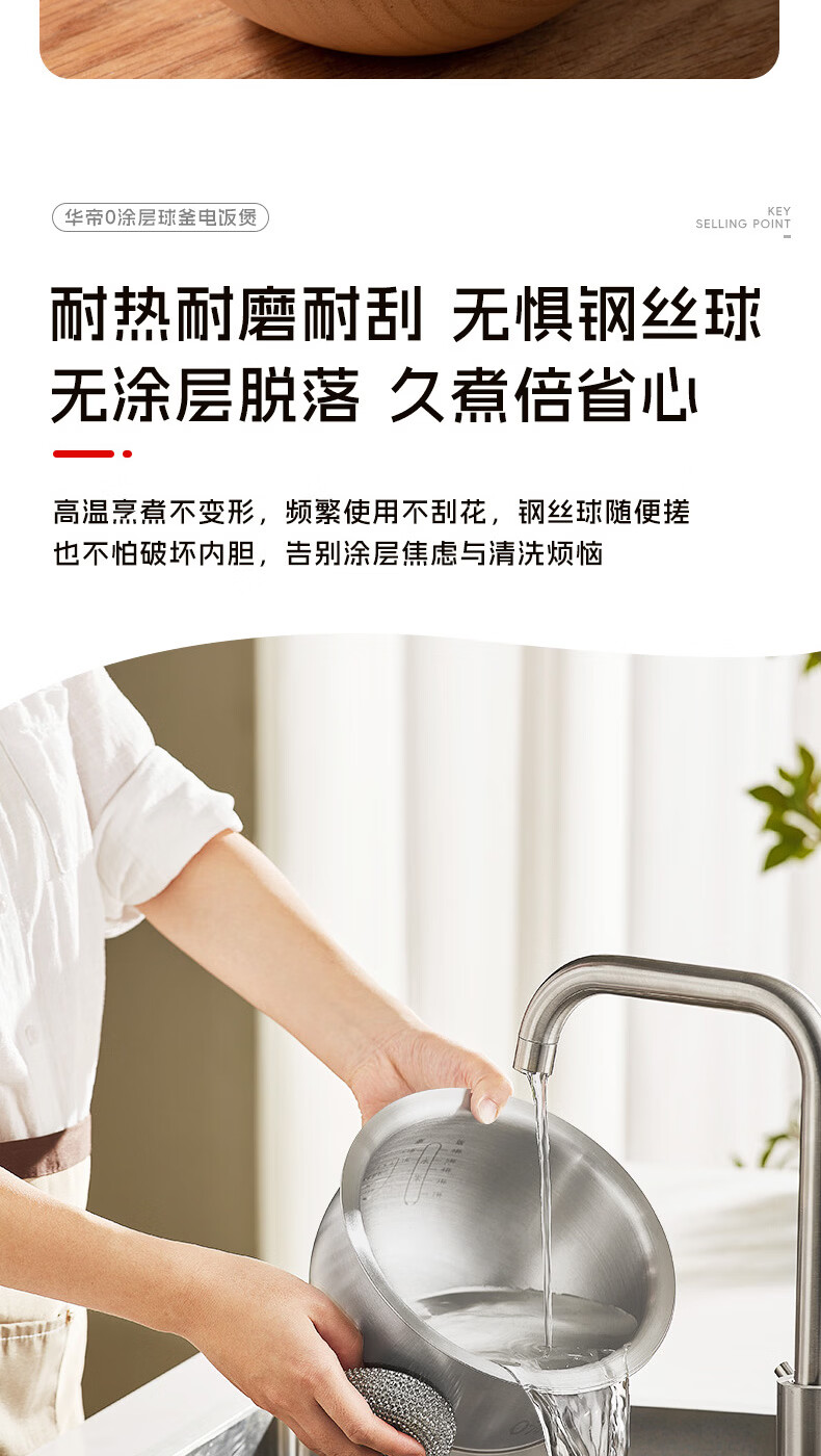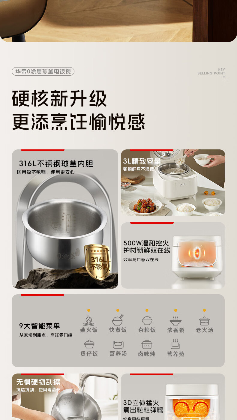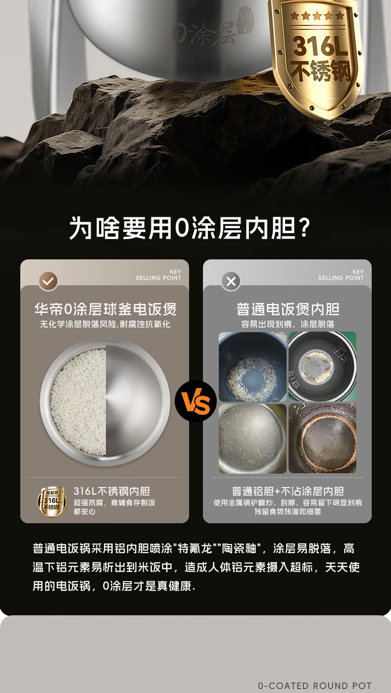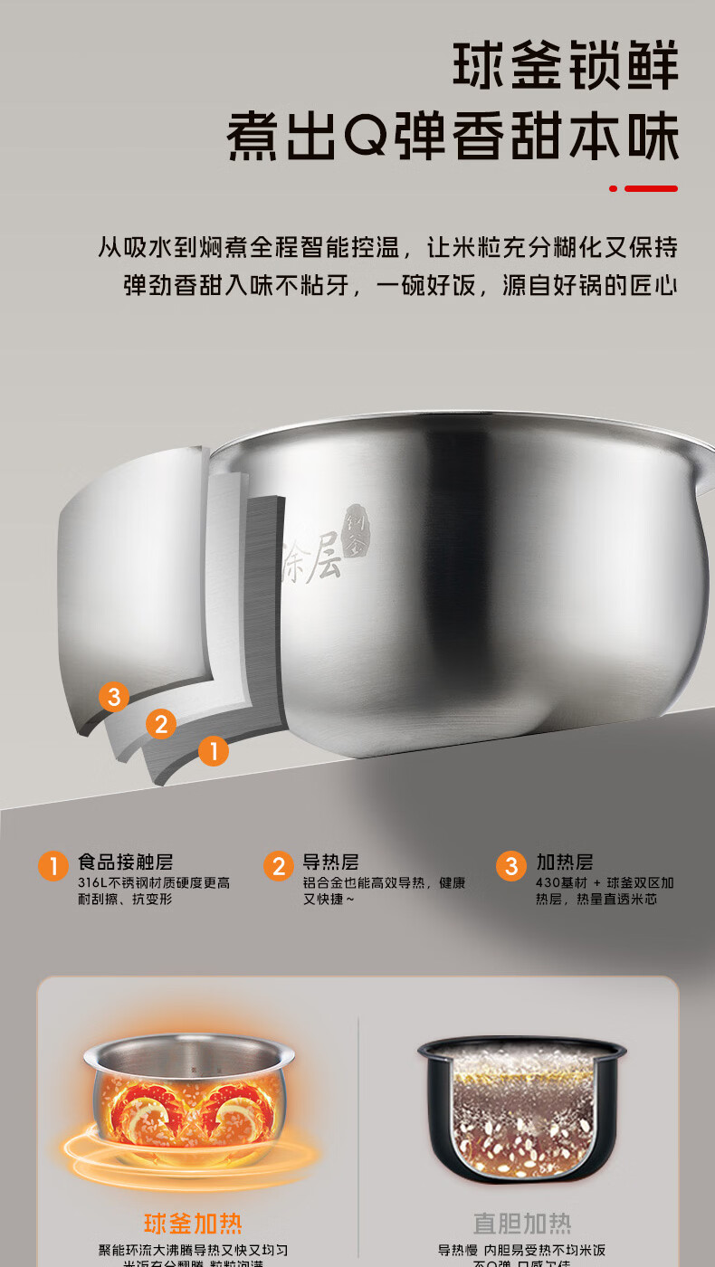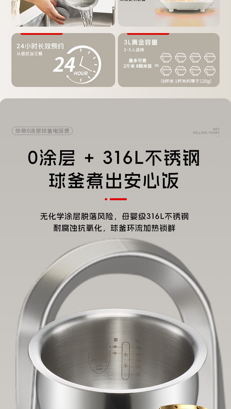 华帝(VATTI)0涂层电饭煲不锈钢球釜米汤分离电饭锅沥米饭低糖3L家用智能预约多功能还原糖健康养生蒸米电饭煲 【0涂层】升级款304不锈钢内胆+沥胆 3L